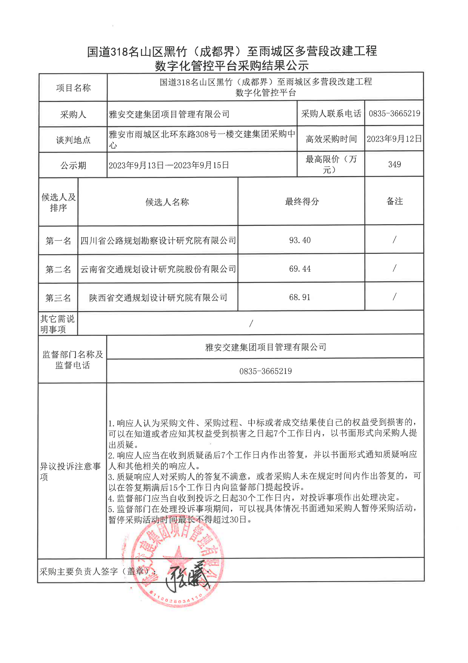 雅安交建集團(tuán)項(xiàng)目管理有限公司國道318名山區(qū)黑竹(成都界)至雨城區(qū)多營段改建工程數(shù)字化管控平臺(tái)采購結(jié)果公示