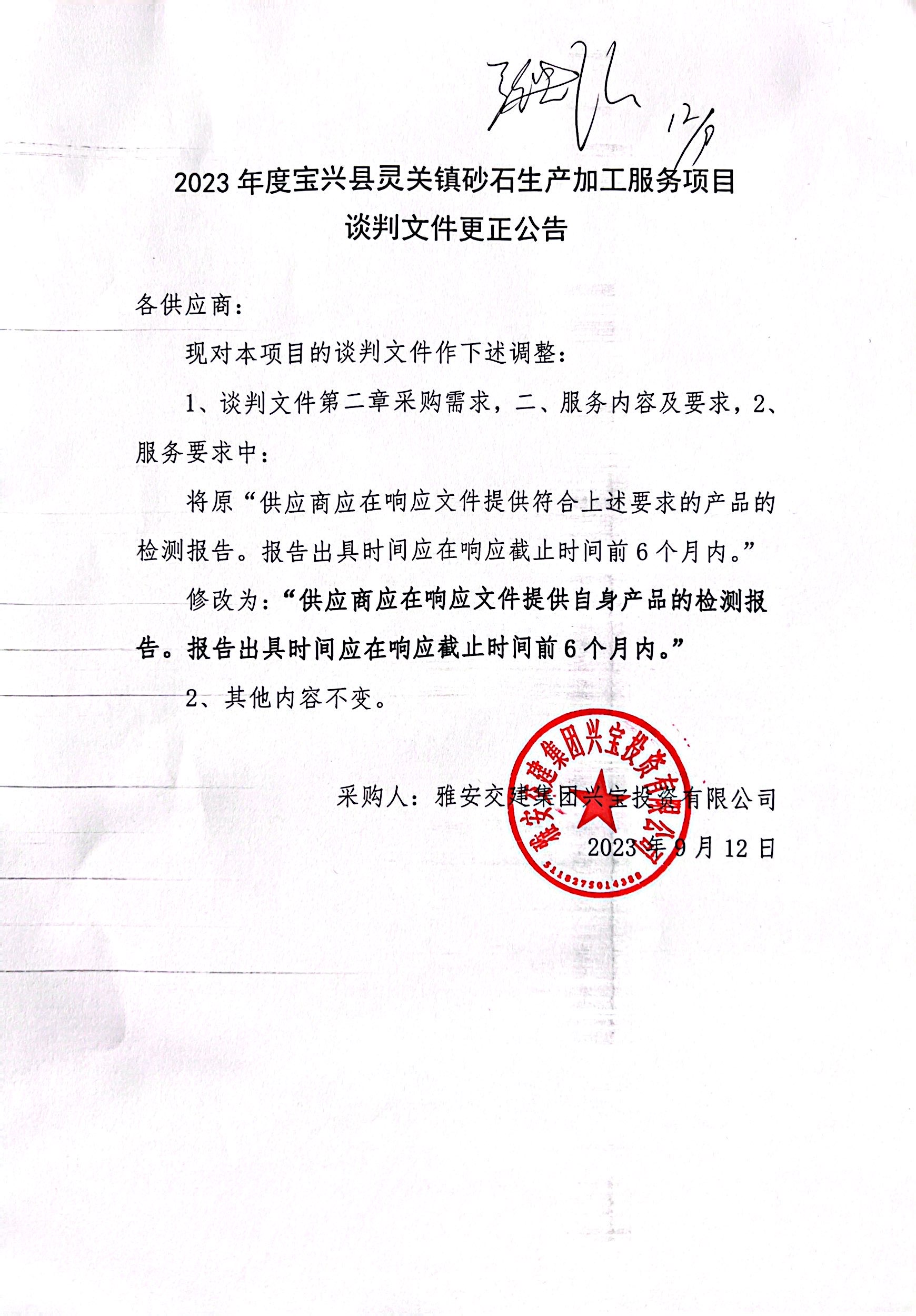 雅安交建集團興寶投資有限公司2023年度寶興縣靈關(guān)鎮(zhèn)砂石生產(chǎn)加工服務(wù)項目談判文件更正公告