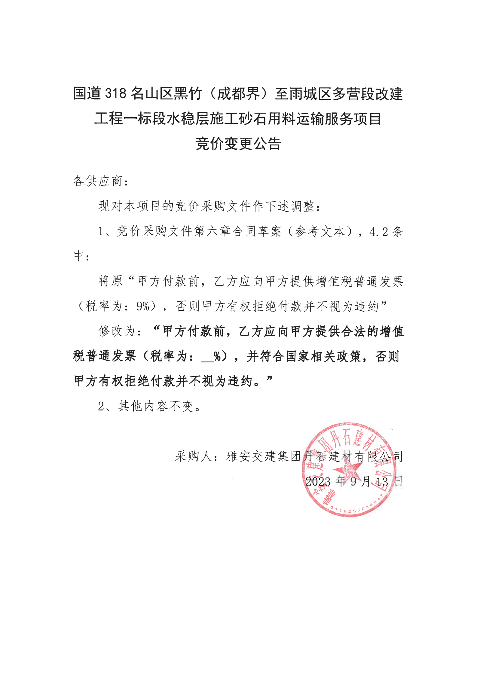 雅安交建集團(tuán)丹石建材有限公司國(guó)道318名山區(qū)黑竹(成都界)至雨城區(qū)多營(yíng)段改建工程一標(biāo)段水穩(wěn)層施工砂石用料運(yùn)輸服務(wù)項(xiàng)目競(jìng)價(jià)變更公告