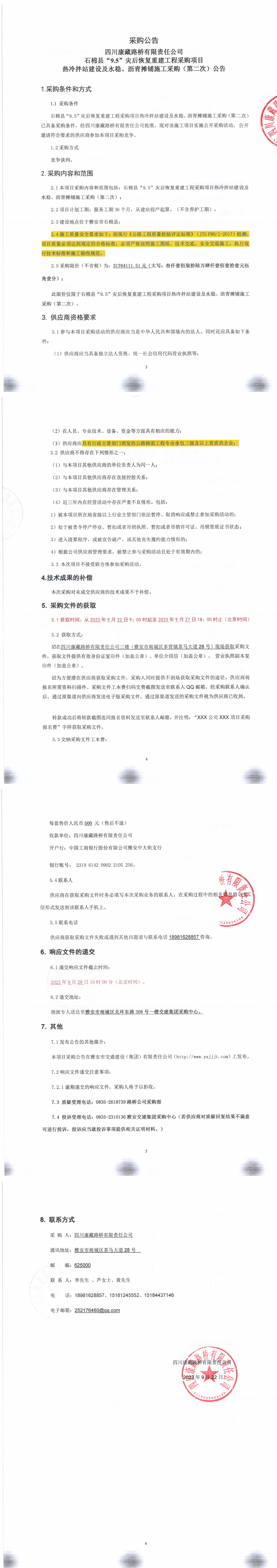 四川康藏路橋有限責任公司石棉縣“9·5”災后恢復重建工程采購項目熱冷拌站建設及水穩(wěn)、瀝青攤鋪施工采購(第二次)公告