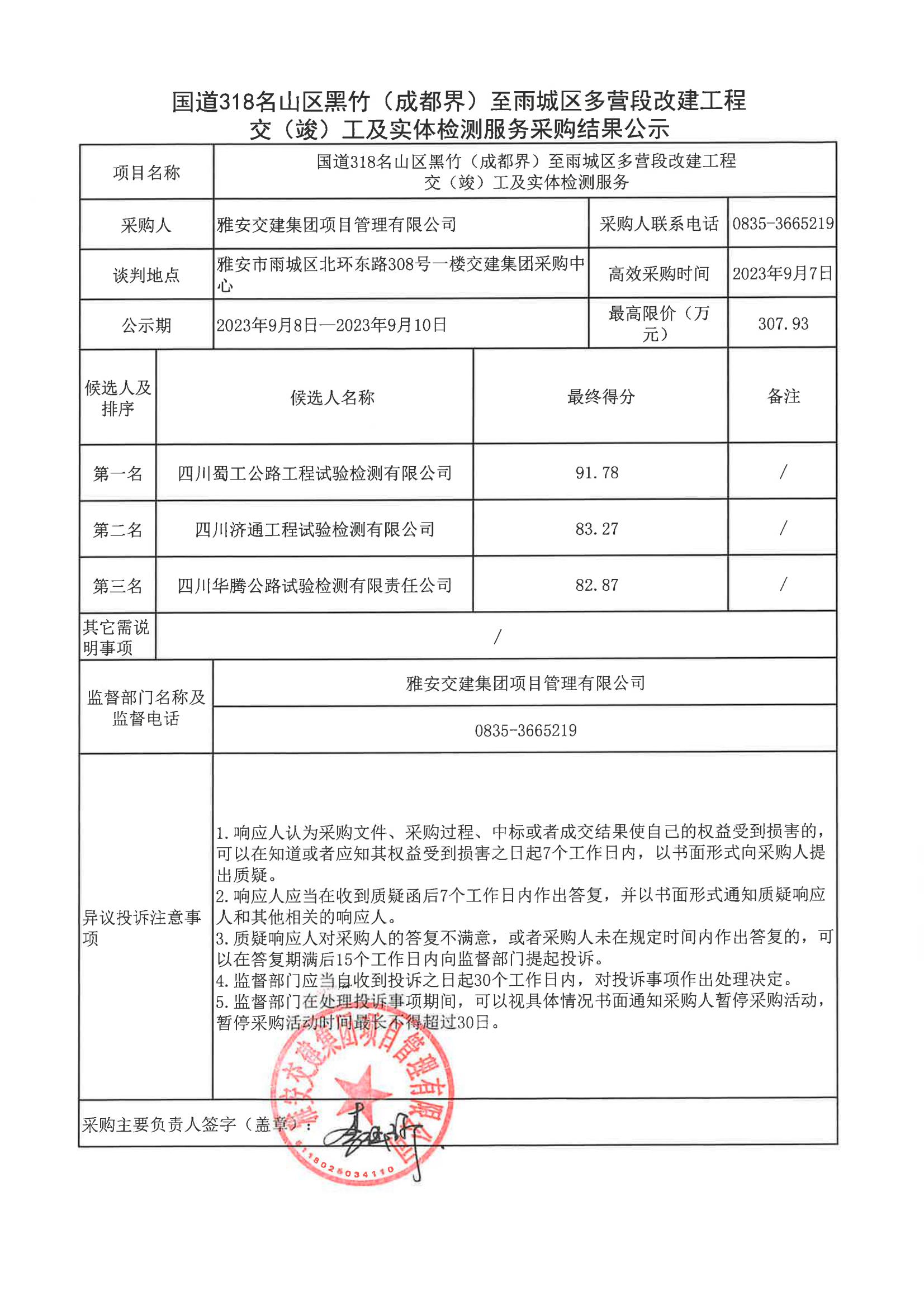雅安交建集團(tuán)項目管理有限公司國道318名山區(qū)黑竹(成都界)至雨城區(qū)多營段改建工程交(竣)工及實(shí)體檢測服務(wù)采購結(jié)果公示
