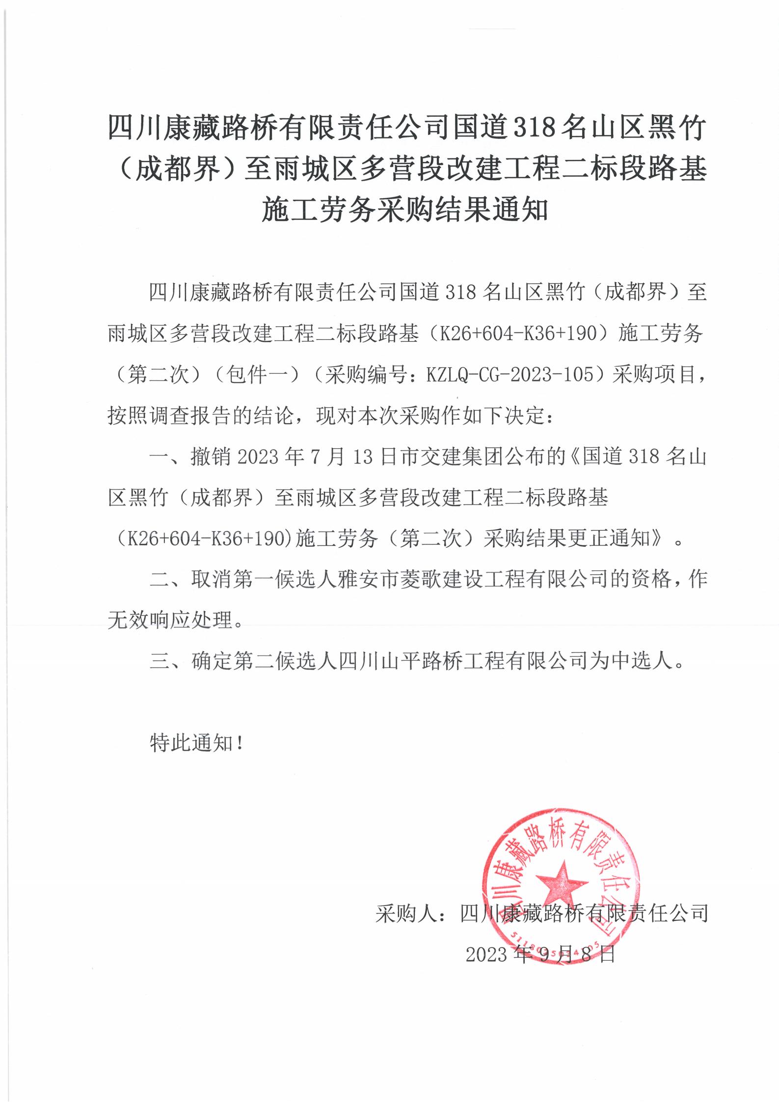 四川康藏路橋有限責任公司國道318名山區(qū)黑竹(成都界)至雨城區(qū)多營段改建工程二標段路基施工勞務采購結(jié)果通知