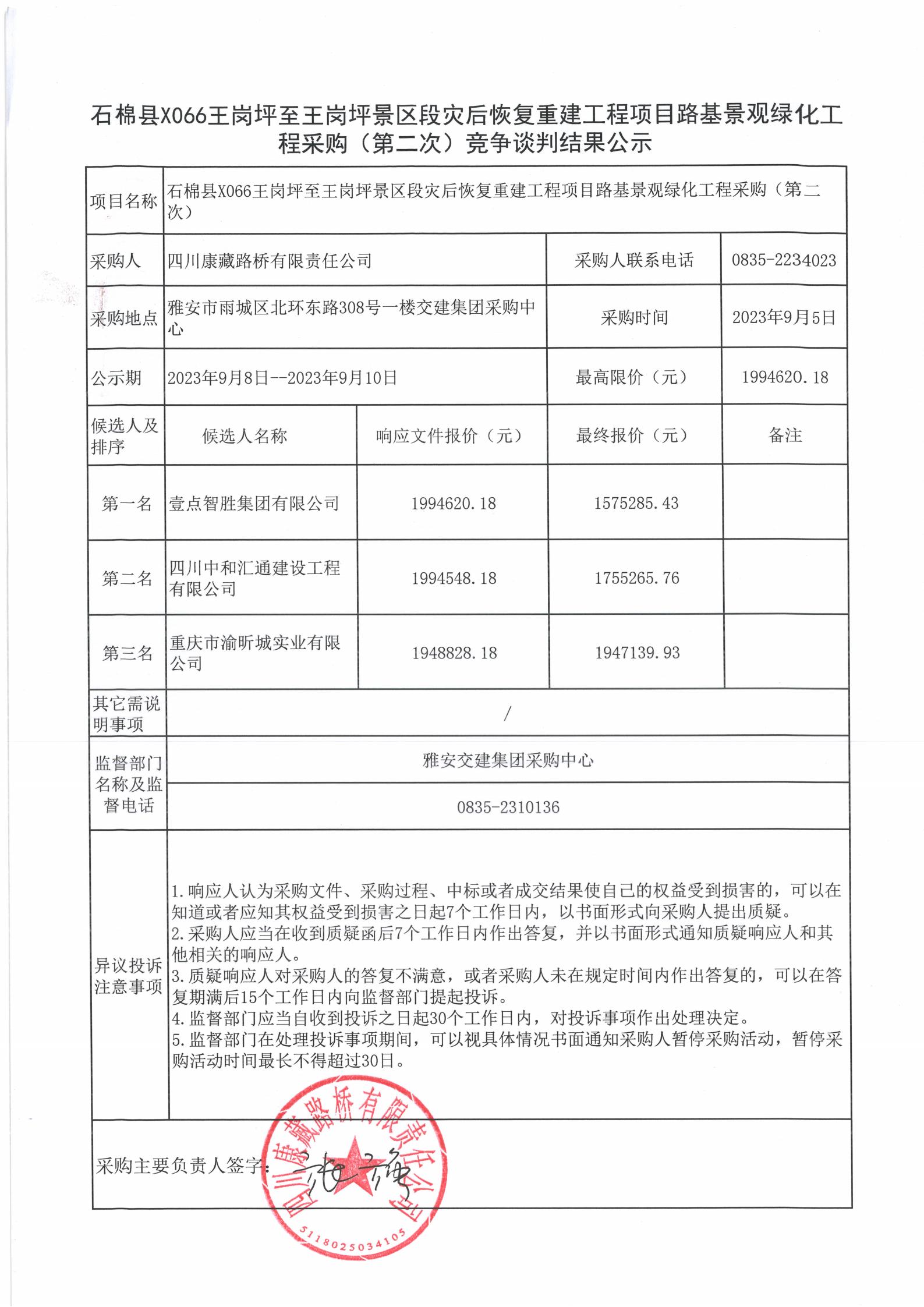 四川康藏路橋有限責(zé)任公司石棉縣X066王崗坪至王崗坪景區(qū)段災(zāi)后恢復(fù)重建工程項(xiàng)目路基景觀綠化工程施工采購(gòu)(第二次)競(jìng)爭(zhēng)談判結(jié)果公示