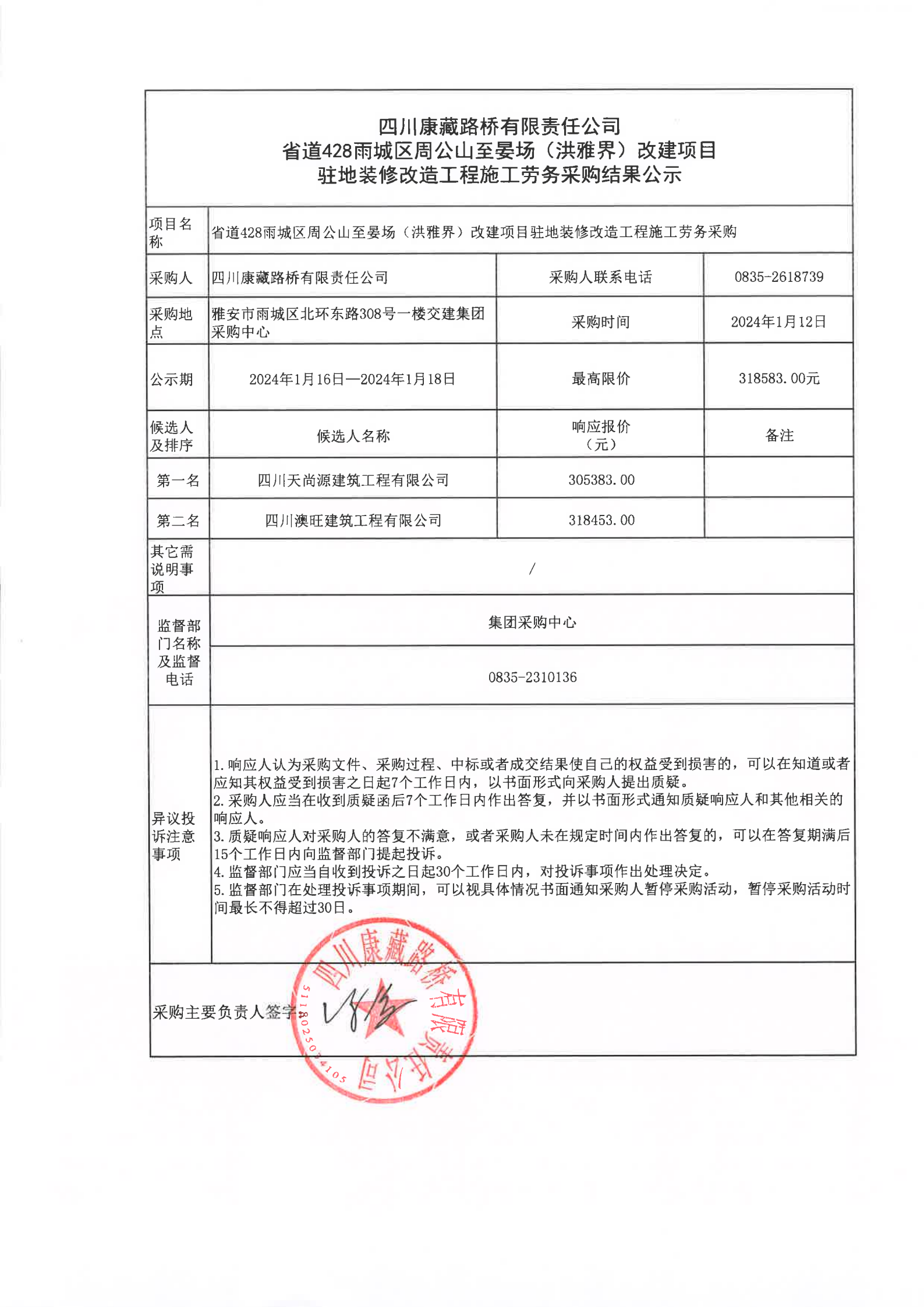 四川康藏路橋有限責(zé)任公司省道428雨城區(qū)周公山至晏場(chǎng)(洪雅界)改建項(xiàng)目駐地裝修改造工程施工勞務(wù)采購(gòu)結(jié)果公示