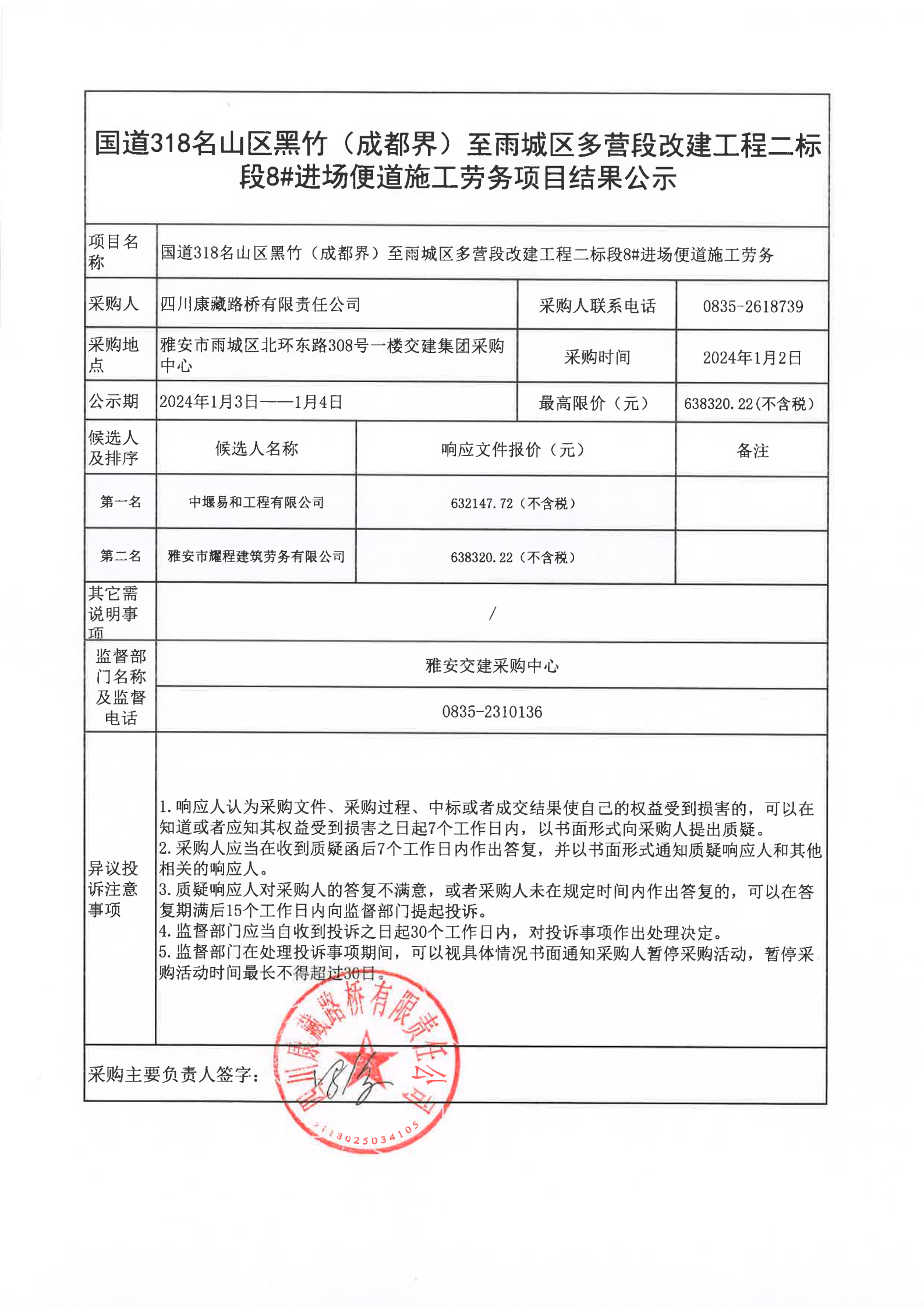 四川康藏路橋有限責(zé)任公司國(guó)道318名山區(qū)黑竹(成都界)至雨城區(qū)多營(yíng)段改建工程二標(biāo)段8#進(jìn)場(chǎng)便道施工勞務(wù)項(xiàng)目結(jié)果公示