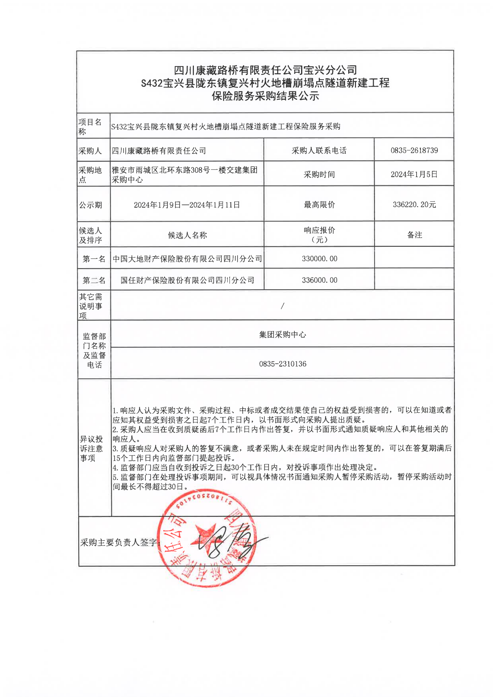 四川康藏路橋有限責任公司S432寶興縣隴東鎮(zhèn)復興村火地槽崩塌點隧道新建工程保險服務(wù)采購結(jié)果公示