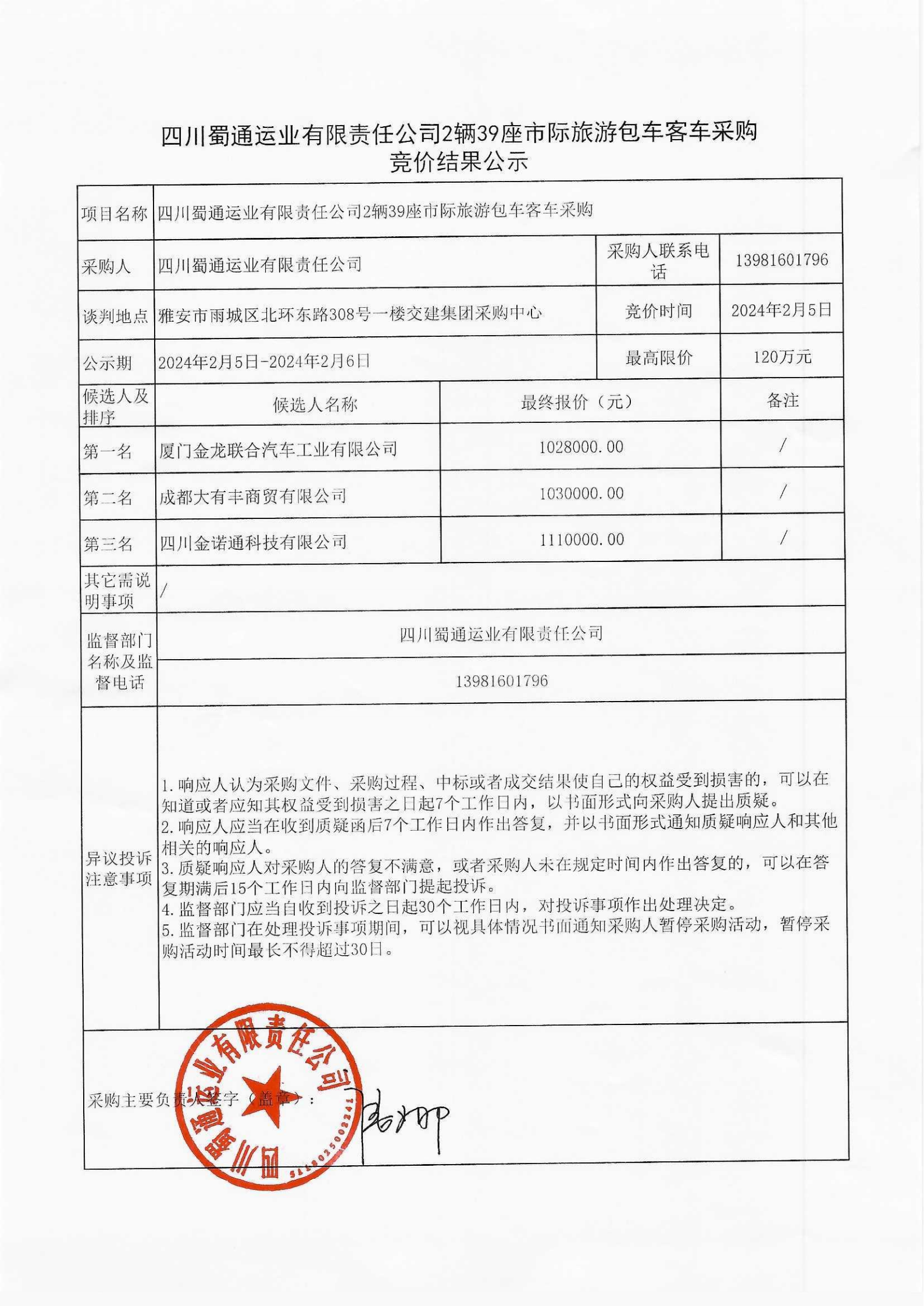 四川蜀通運(yùn)業(yè)有限責(zé)任公司2輛39座市際旅游包車客車采購(gòu)競(jìng)價(jià)結(jié)果公示