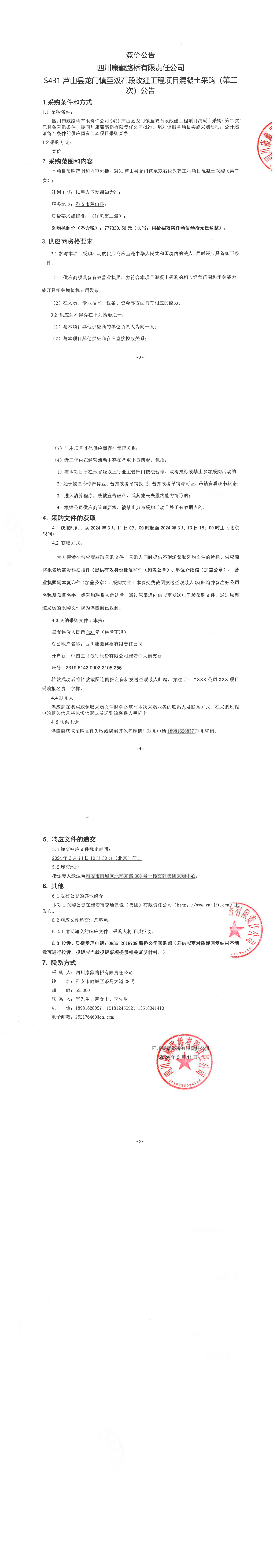 四川康藏路橋有限責(zé)任公司S431蘆山縣龍門(mén)鎮(zhèn)至雙石段改建工程項(xiàng)目混凝土采購(gòu)(第二次)公告