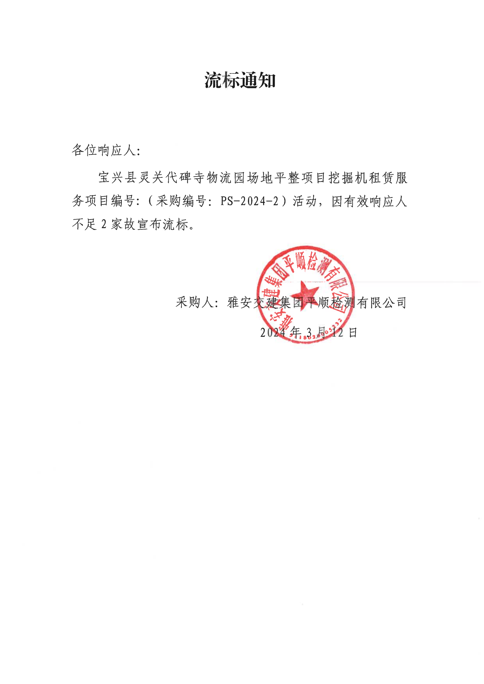 雅安交建集團平順檢測有限公司寶興縣靈關(guān)代碑寺物流園場地平整項目挖掘機租賃服務流標通知