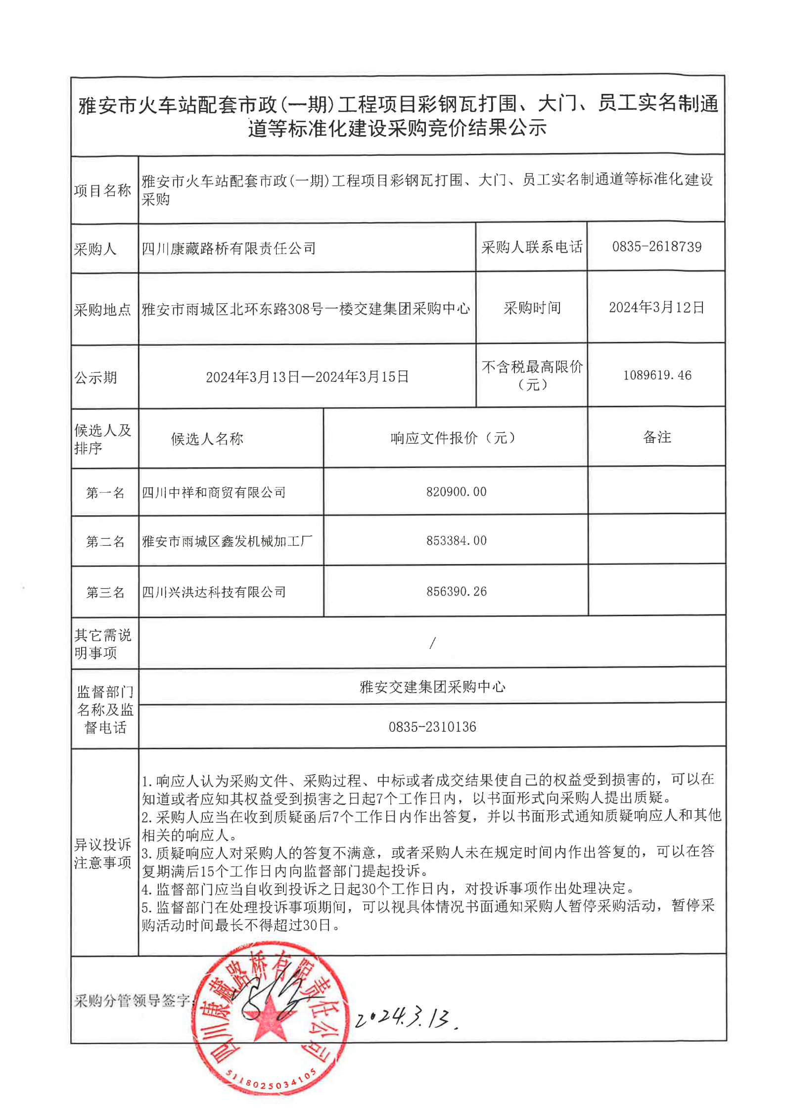 四川康藏路橋有限責任公司雅安市火車站配套市政(一期)工程項目彩鋼瓦打圍、大門、員工實名制通道等標準化建設采購結(jié)果公示