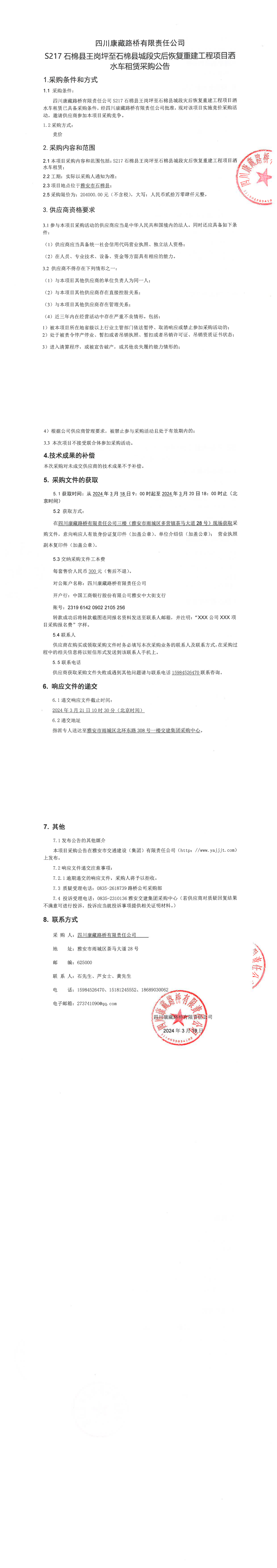 四川康藏路橋有限責任公司S217石棉縣王崗坪至石棉縣城段災后恢復重建工程項目灑水車租賃采購公告