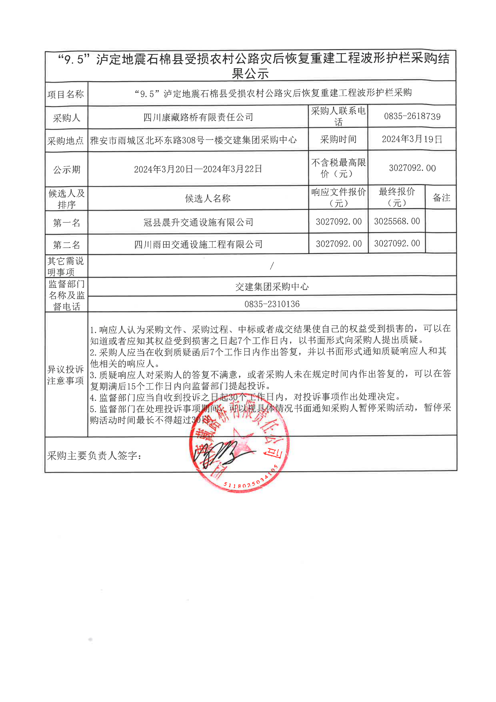 四川康藏路橋有限責任公司“9.5”瀘定地震石棉縣受損農(nóng)村公路災后恢復重建工程波形護欄采購結(jié)果公示