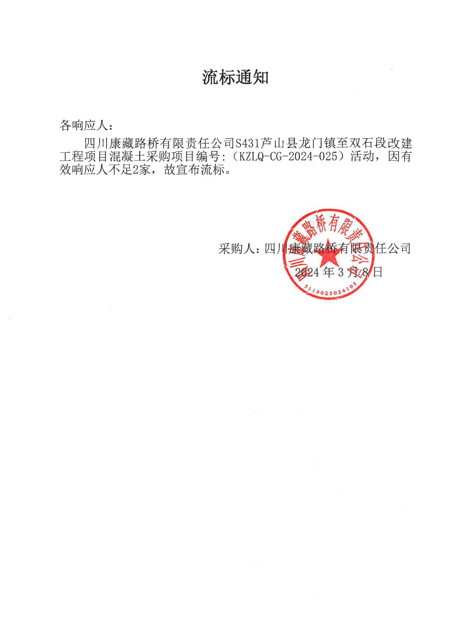 四川康藏路橋有限責(zé)任公司S431蘆山縣龍門鎮(zhèn)至雙石段改建工程項目混凝土采購流標(biāo)通知