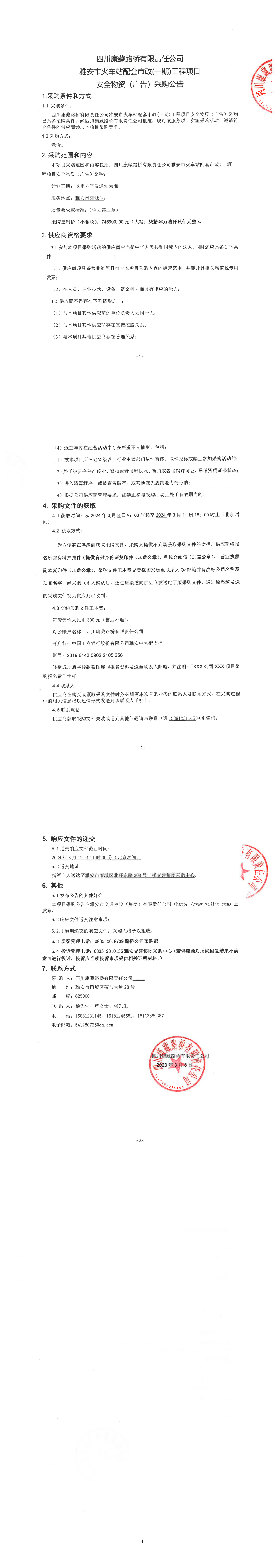四川康藏路橋有限責任公司雅安市火車站配套市政(一期)工程項目安全物質(zhì)(廣告)采購公告