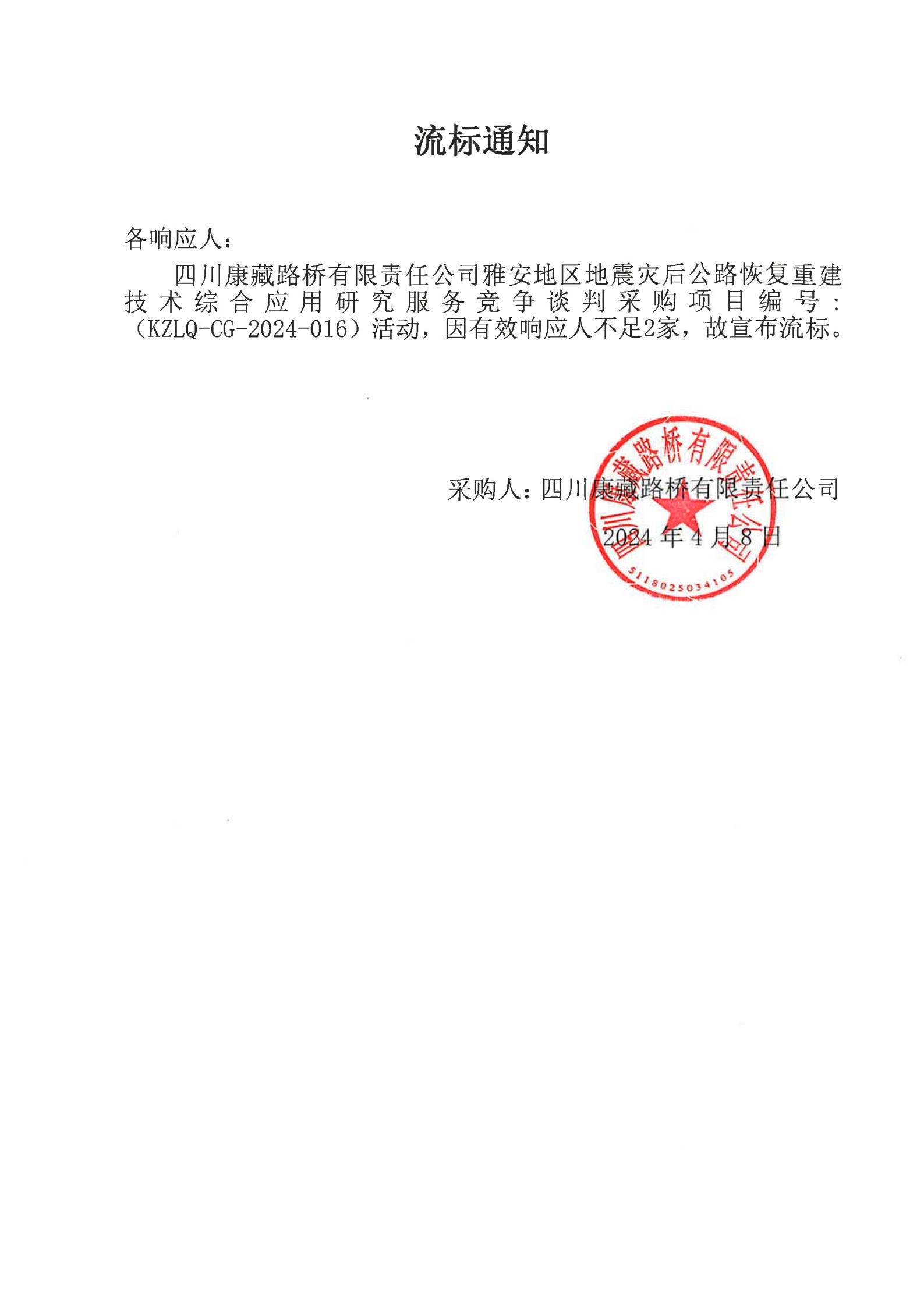 四川康藏路橋有限責(zé)任公司雅安地區(qū)地震災(zāi)后公路恢復(fù)重建技術(shù)綜合應(yīng)用研究服務(wù)流標通知