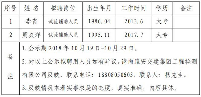 雅安交建集團(tuán)工程檢測(cè)有限公司擬聘用人員公示