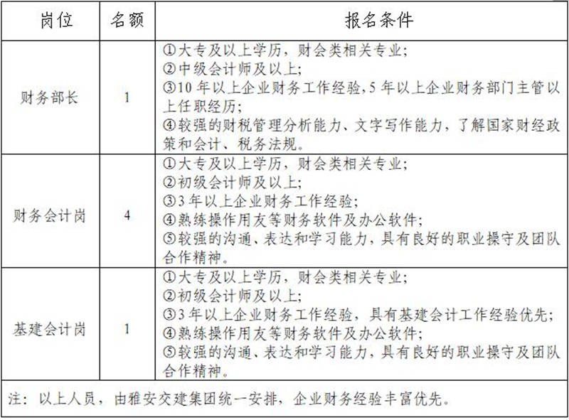 根據(jù)發(fā)展需要,決定面向社會公開招聘雅安市交通建設(集團)有限責任公司(以下簡稱“雅安交建集團”)所屬子公司財務部門負責人1名,工作人員5名,現(xiàn)將有關事項公告如下: