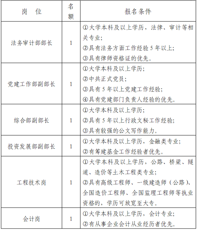 雅安市交建集團(tuán)是市屬重點(diǎn)國有企業(yè),主要從事交通基礎(chǔ)設(shè)施及配套服務(wù)設(shè)施的投資、建設(shè)、經(jīng)營和交通資源的開發(fā)利用等業(yè)務(wù)。根據(jù)公司發(fā)展需要,決定面向社會公開招聘6名工作人員,現(xiàn)將有關(guān)事項公告如下: