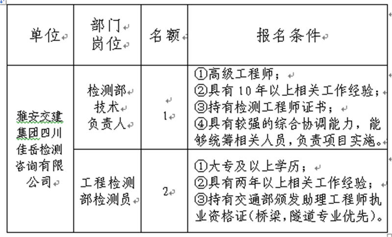 根據(jù)發(fā)展需要,決定面向社會公開招聘雅安市交通建設(shè)(集團)有限責任公司(以下簡稱“雅安交建集團”)所屬子公司工作人員3名,現(xiàn)將有關(guān)事項公告如下: