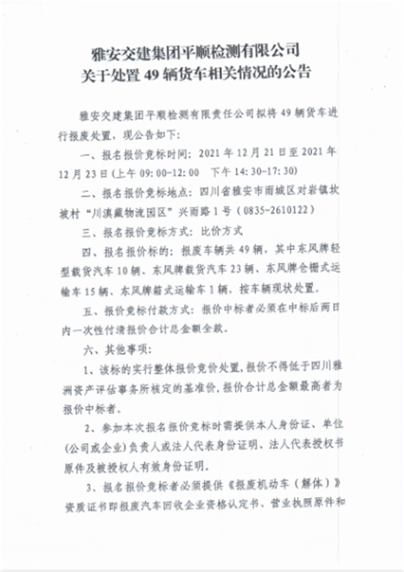 雅安交建集團(tuán)平順檢測(cè)有限公司 關(guān)于處置49輛貨車相關(guān)情況的公告