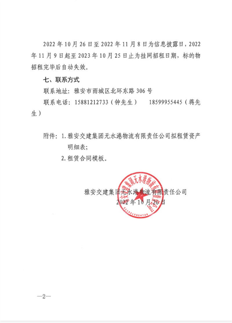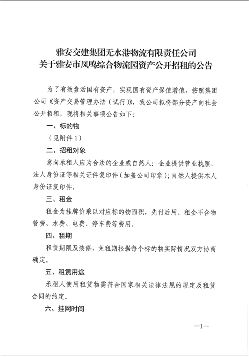雅安交建集團無水港物流有限責(zé)任公司關(guān)于雅安市鳳鳴綜合物流園資產(chǎn)公開招租的公告