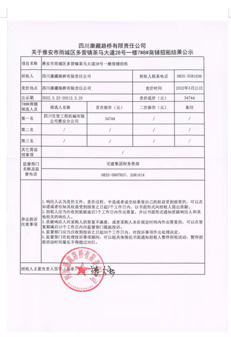 四川康藏路橋有限責任公司關于雅安市雨城區(qū)多營鎮(zhèn)茶馬大道28號一樓7#8#商鋪招租結果公示