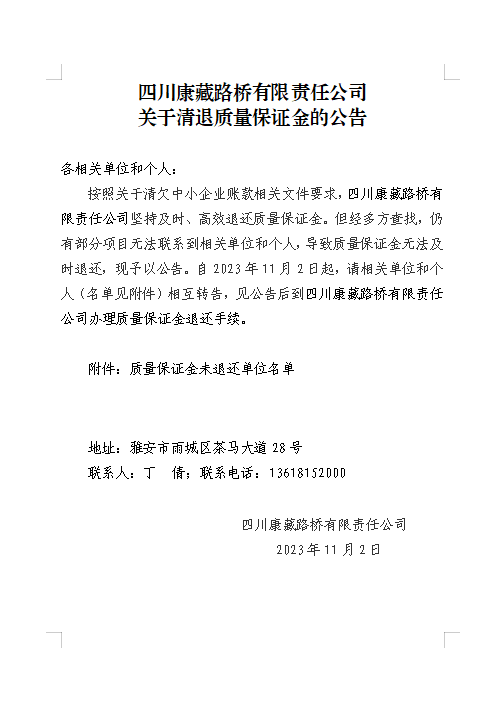 四川康藏路橋有限責(zé)任公司關(guān)于清退質(zhì)量保證金的公告