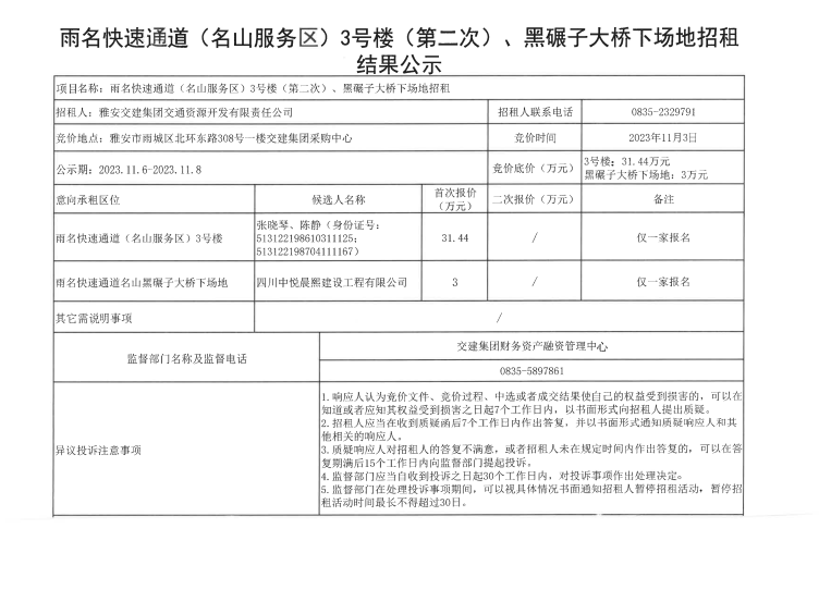 ÑŰ²½»½¨¼¯ˆF(tu¨¢n)½»Í¨ÙYÔ´é_°l(f¨¡)ÓÐÏÞØŸ(z¨¦)Èι«Ë¾ÓêÃû¿ìËÙͨµÀ£¨Ãûɽ·þ„Õ(w¨´)…^(q¨±)£©3Ì–˜Ç£¨µÚ¶þ´Î£©ºÚÄë×Ó´ó˜òψöµØÕÐ×â½Y(ji¨¦)¹û¹«Ê¾