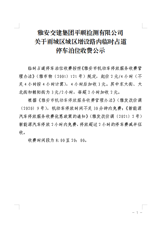 雅安交建集團(tuán)平順檢測有限公司 關(guān)于雨城區(qū)城區(qū)增設(shè)路內(nèi)臨時占道 停車泊位收費公示附件