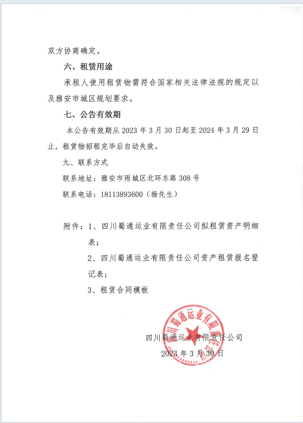 蜀通運業(yè)有限責(zé)任公司關(guān)于閑置資產(chǎn)公開招租的公告附件