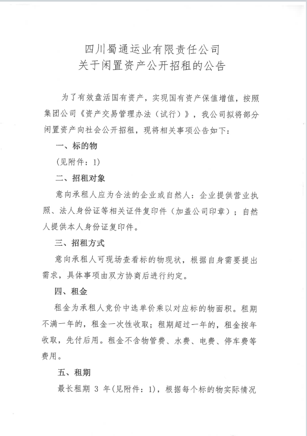 蜀通運業(yè)有限責(zé)任公司關(guān)于閑置資產(chǎn)公開招租的公告