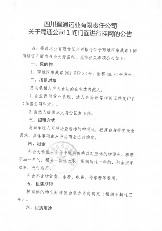 四川蜀通運業(yè)有限責(zé)任公司關(guān)于蜀通公司1間門面進行掛網(wǎng)的公告