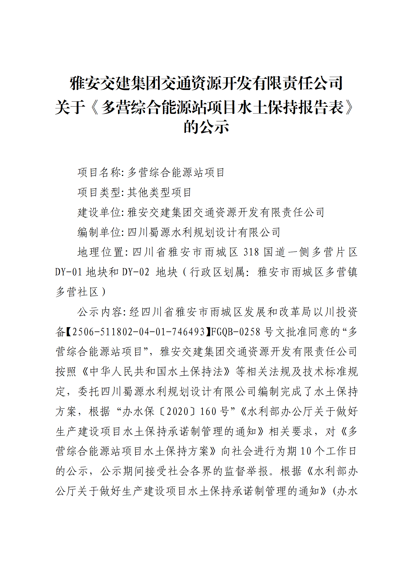雅安交建集團(tuán)交通資源開發(fā)有限責(zé)任公司 關(guān)于《多營(yíng)綜合能源站項(xiàng)目水土保持報(bào)告表》的公示