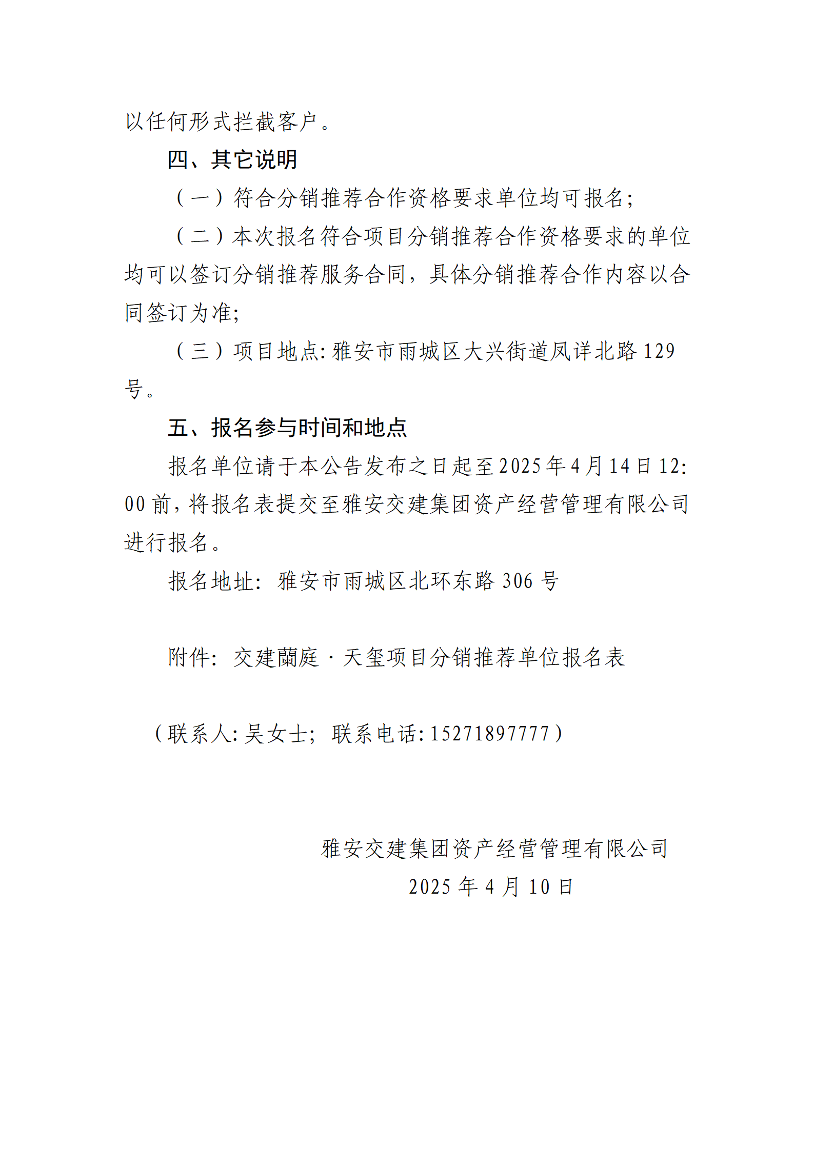 雅安交建集團資產(chǎn)經(jīng)營管理有限公司 關(guān)于征集蘭庭·天璽項目分銷推薦合作單位的公告