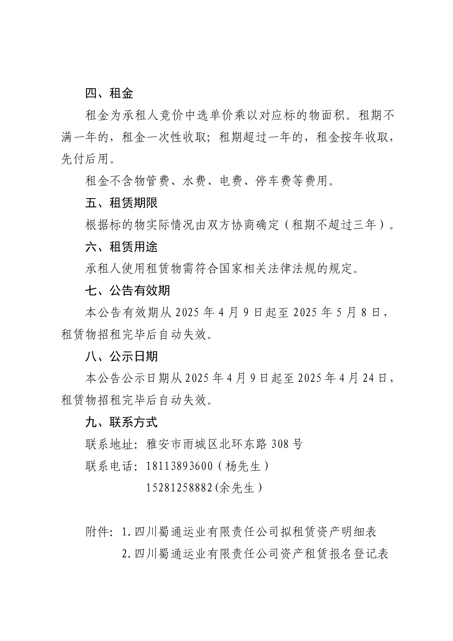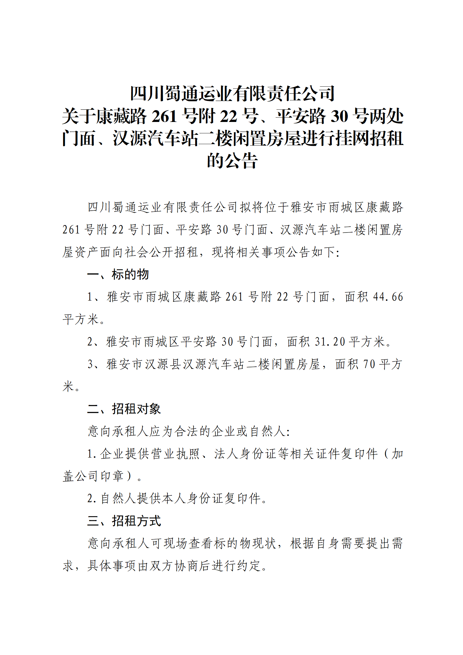 四川蜀通運(yùn)業(yè)有限責(zé)任公司 關(guān)于康藏路261號(hào)附22號(hào)、平安路30號(hào)兩處門(mén)面、漢源汽車(chē)站二樓閑置房屋進(jìn)行掛網(wǎng)招租的公告
