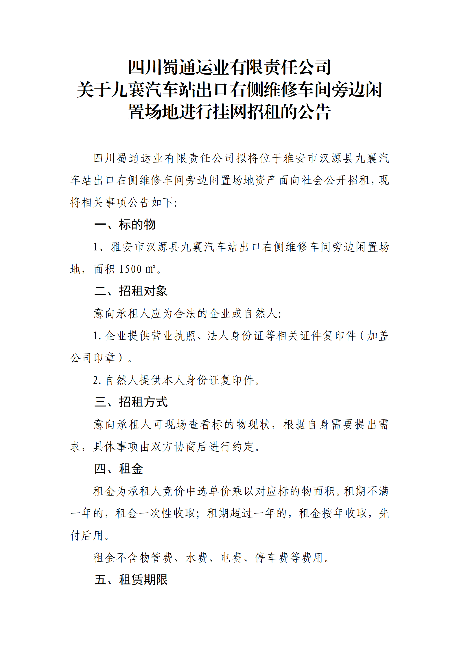 四川蜀通運(yùn)業(yè)有限責(zé)任公司 關(guān)于九襄汽車(chē)站出口右側(cè)維修車(chē)間旁邊閑置場(chǎng)地進(jìn)行掛網(wǎng)招租的公告
