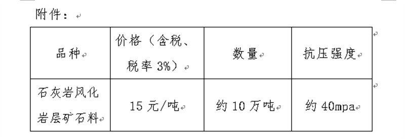 現(xiàn)將我公司礦山首采平臺(tái)的石灰?guī)r風(fēng)化巖層礦石料定價(jià)出售事宜進(jìn)行公示(見附件),經(jīng)公司研究決定,定價(jià)出售風(fēng)化巖層礦石料約10萬噸,現(xiàn)通過集團(tuán)公司官網(wǎng)信息公示后對(duì)外銷售。報(bào)名客戶數(shù)不限,銷售方式為先款后貨,簽約銷售,銷售時(shí)間以礦山開采和生產(chǎn)計(jì)劃為準(zhǔn)。