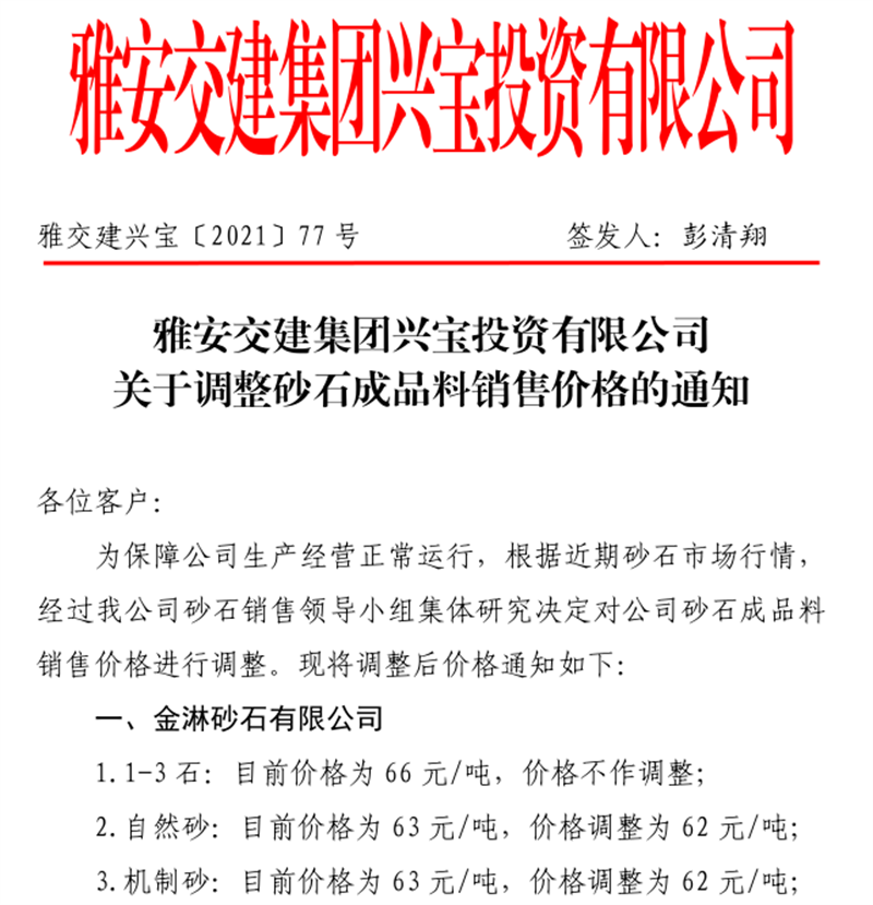雅安交建集團(tuán)云石公司關(guān)于調(diào)整成品料銷售價(jià)格的通知(2021.11.4)