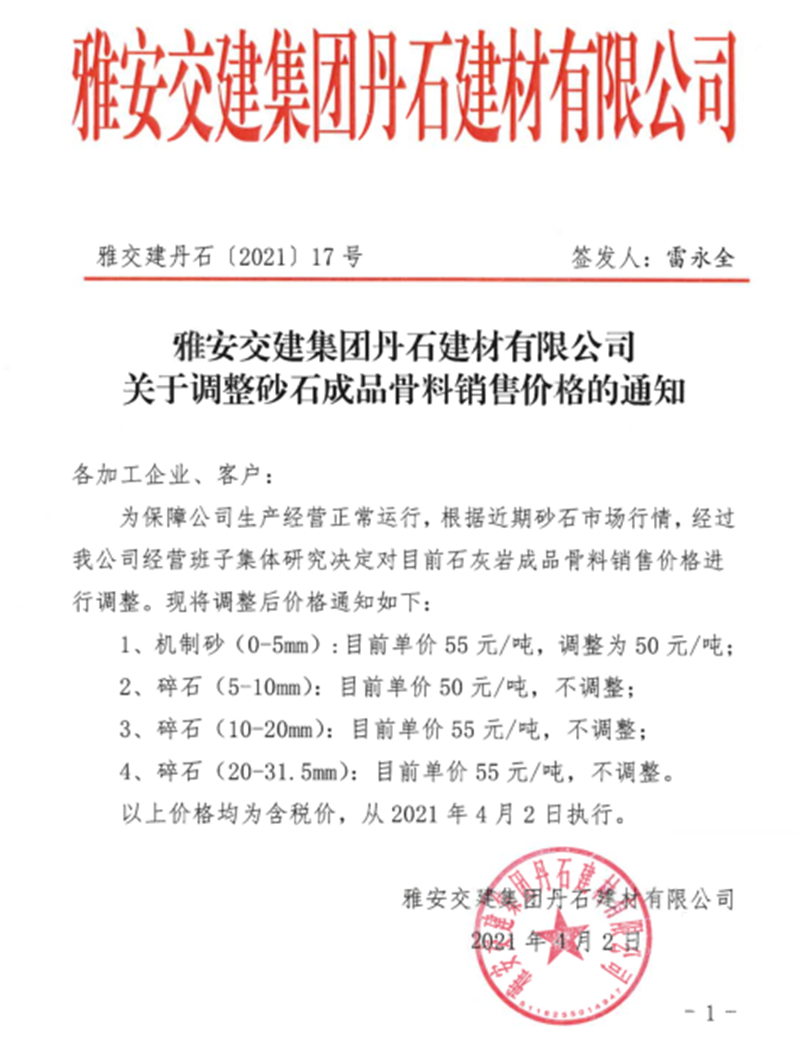 雅安交建集團(tuán)興寶公司砂石骨料銷(xiāo)售價(jià)格情況表(2021.2.28)