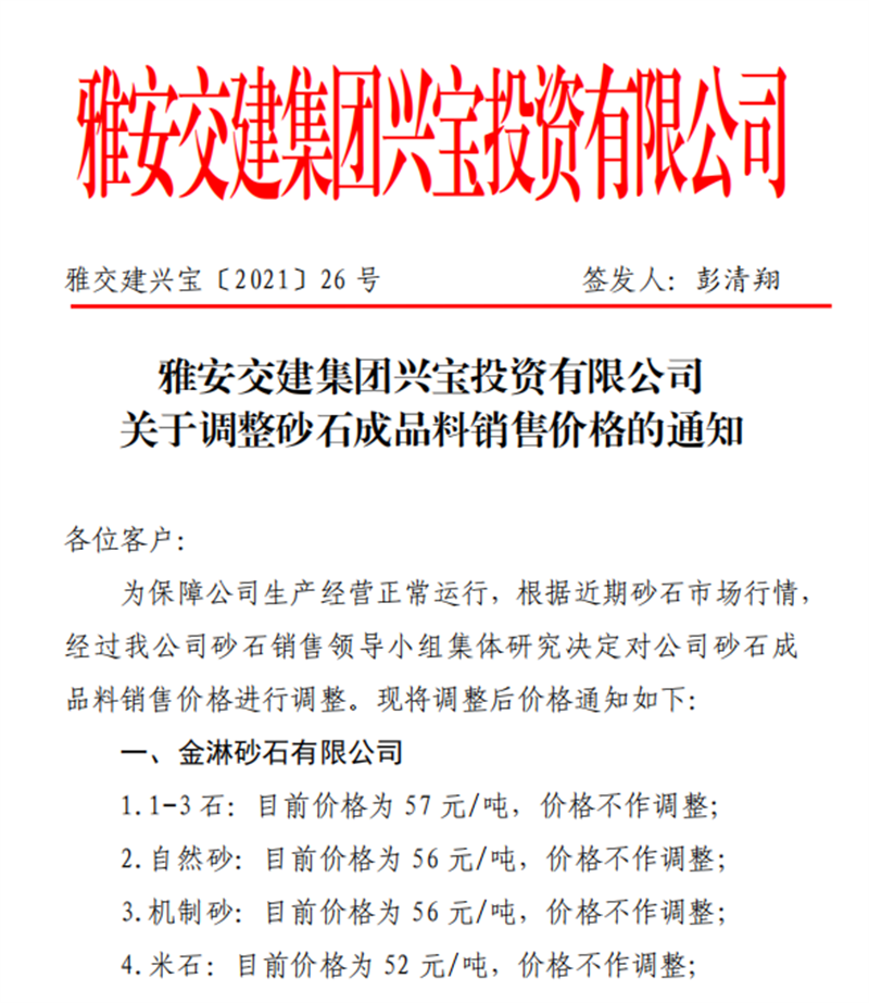 雅安交建集團(tuán)興寶公司砂石骨料銷售價(jià)格情況表(2021.4.30)