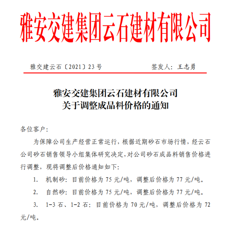 雅安交建集團(tuán)云石公司砂石骨料銷售價格情況表(2021.5.3)