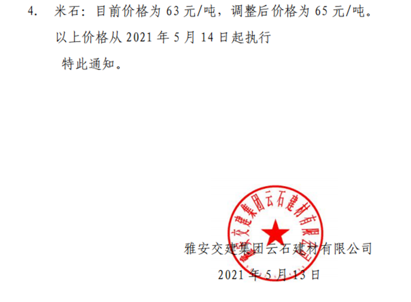 雅安交建集團(tuán)云石公司砂石骨料銷售價格情況表(2021.5.14)
