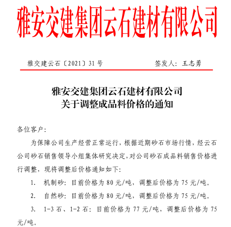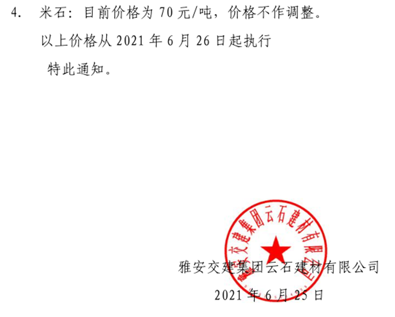 雅安交建集團(tuán)云石公司砂石骨料銷售價格情況表(2021.7.12)