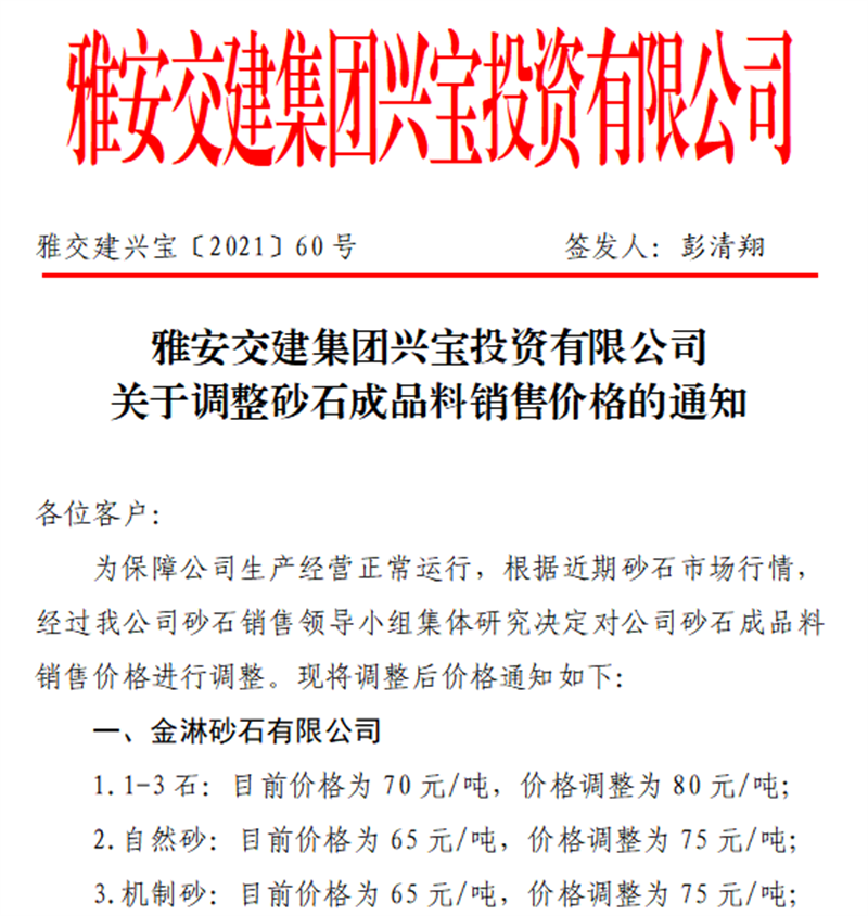 雅安交建集團云石公司關于調整成品料銷售價格的通知(2021.11.4)