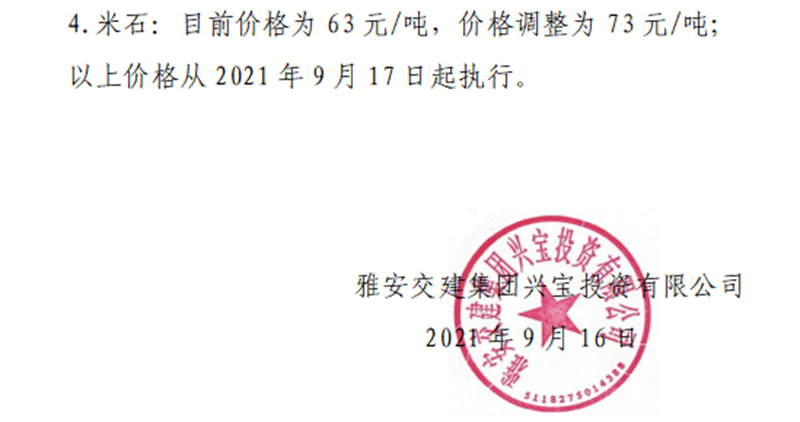 雅安交建集團云石公司關于調整成品料銷售價格的通知(2021.9.13)