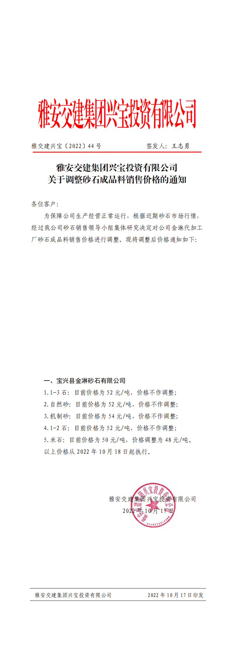 ÑŽ»½¨ÅdŒš¡²2022¡³44Ì–(h¨¤o) êP(gu¨¡n)ÓÚÕ{(di¨¤o)Õûɰʯ³ÉÆ·ÁÏäNÊÛƒr(ji¨¤)¸ñµÄ֪ͨ10.17