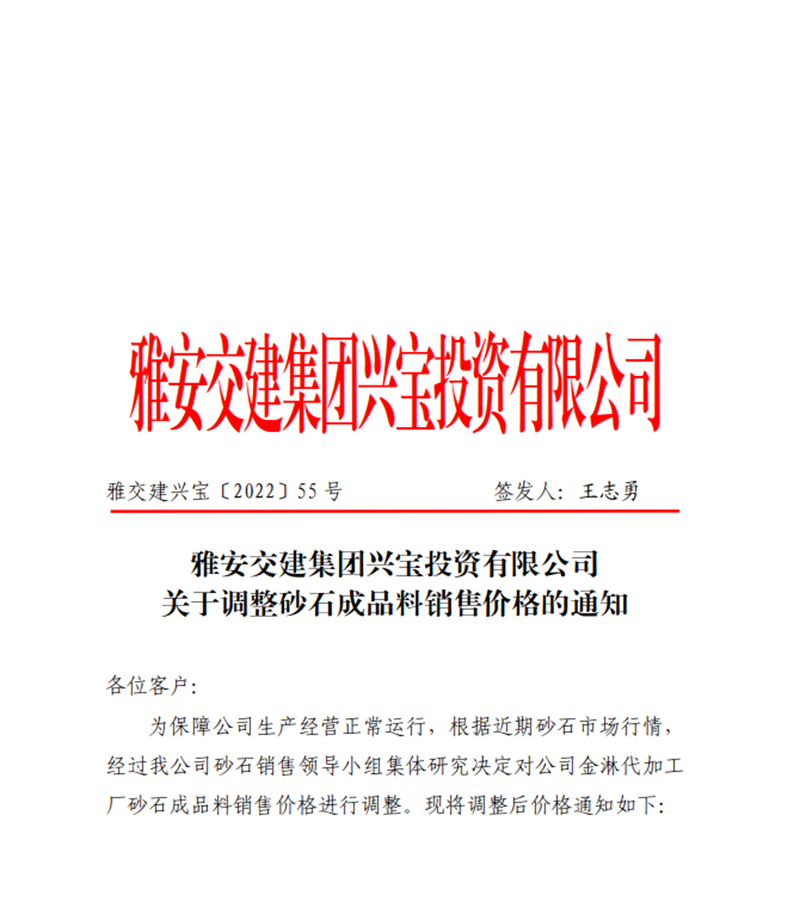 雅交建興寶〔2022〕55號(hào) 關(guān)于調(diào)整砂石成品料銷售價(jià)格的通知-11.5