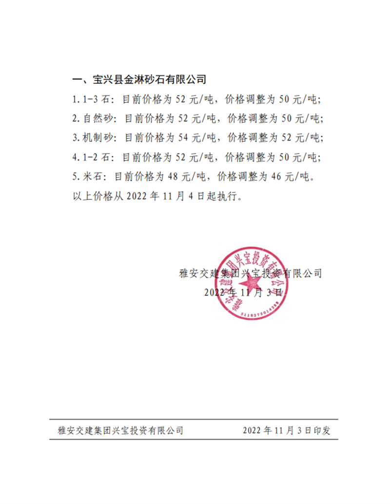 雅交建興寶〔2022〕44號(hào) 關(guān)于調(diào)整砂石成品料銷售價(jià)格的通知10.17