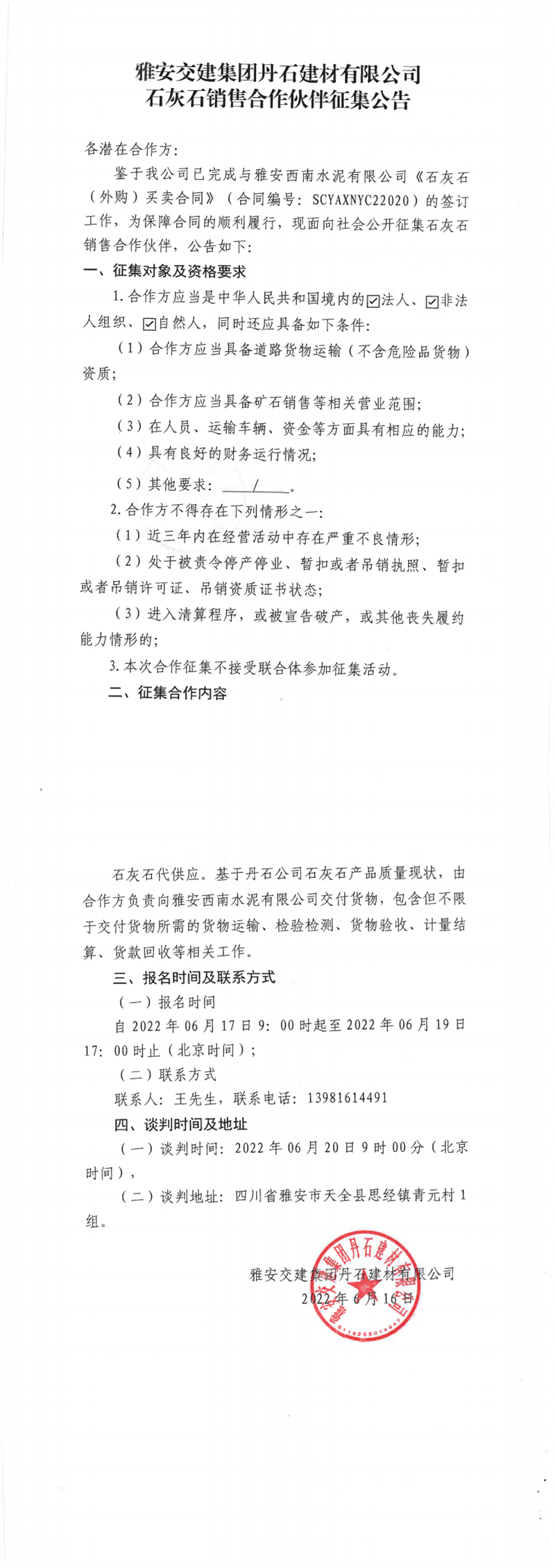 雅安交建集團(tuán)丹石建材有限公司石灰石銷(xiāo)售合作伙伴征集公告6-16