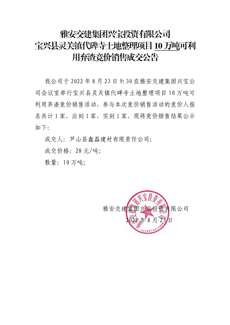 雅安交建集團(tuán)興寶投資有限公司寶興縣靈關(guān)鎮(zhèn)代碑寺土地整理項(xiàng)目10萬(wàn)噸可利用棄渣競(jìng)價(jià)銷(xiāo)售成交公告(8.23)